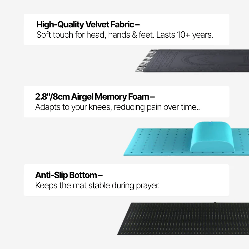 The foam allows your knees to sink smoothly, reducing inflammation and giving joints time to recover between prayers instead of absorbing constant impact.